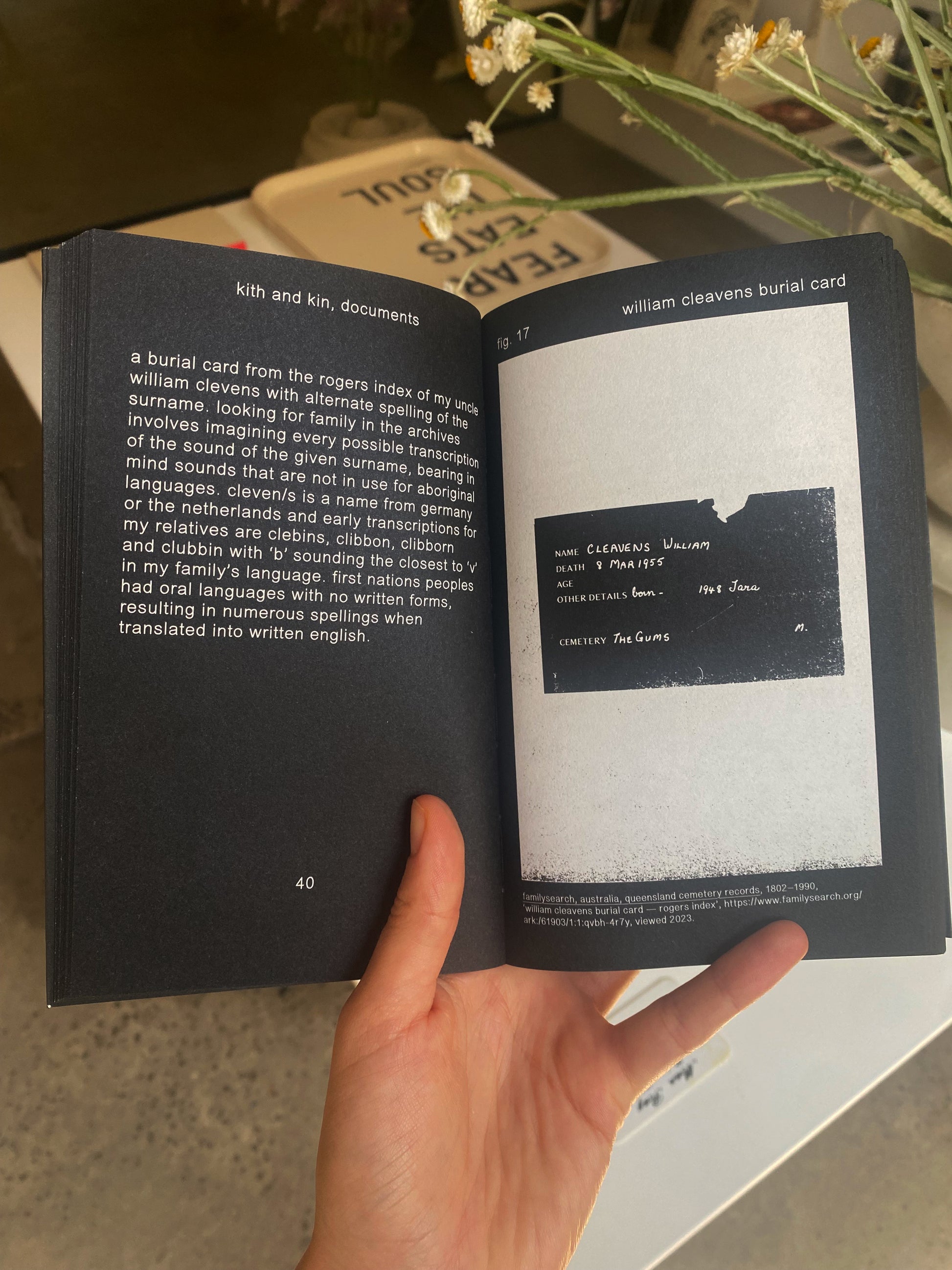 Kamilaroi/Bigambul artist Archie Moore is renowned for politically astute and materially delicate portrays of self and national histories. This black monograph draws upon the artist’s research with family, community and archivists to celebrate First Nations Australian sovereignty and kinship ties that span more than 2,400 generations and 65,000 years. Archie’s extensive genealogical project captures the common ancestors of all humans, emphasising the universality of the family tree. Essays highlight how Archie enacts Indigenous language maintenance and confronts ongoing legacies of colonisation, including the overincarceration of Indigenous peoples in Australia. The publication centres a First Nations Australian understanding of time, where past, present and future are coexistent. The book and corresponding exhibition curated by Ellie Buttrose are commissioned by Creative Australia.