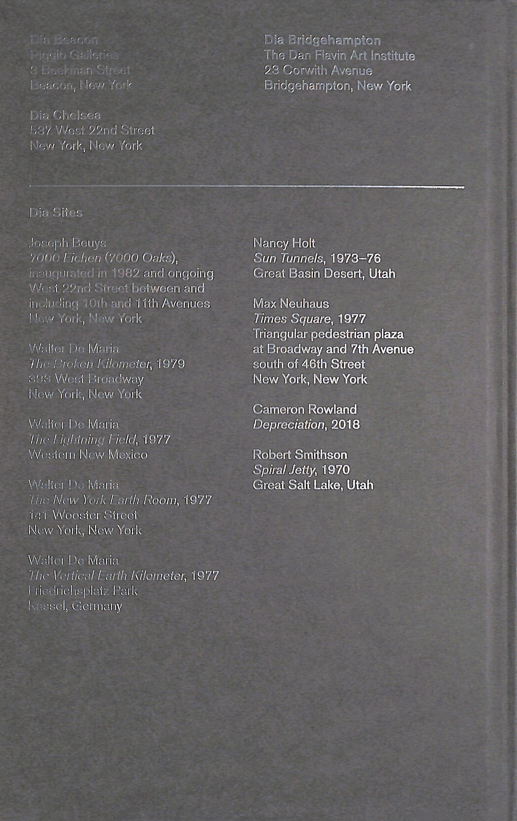 Widely known for Dia Beacon, a destination museum in the Hudson Valley, Dia is the steward for seven dedicated artist sites and maintains four non-traditional exhibition spaces. Released with the reopening of Dia Chelsea in New York, this handy guidebook maps Dia Art Foundation’s constellation of 11 art spaces across the globe. Designed with art lovers and dedicated art tourists in mind, the book charts the institution’s bold history and experimental present.