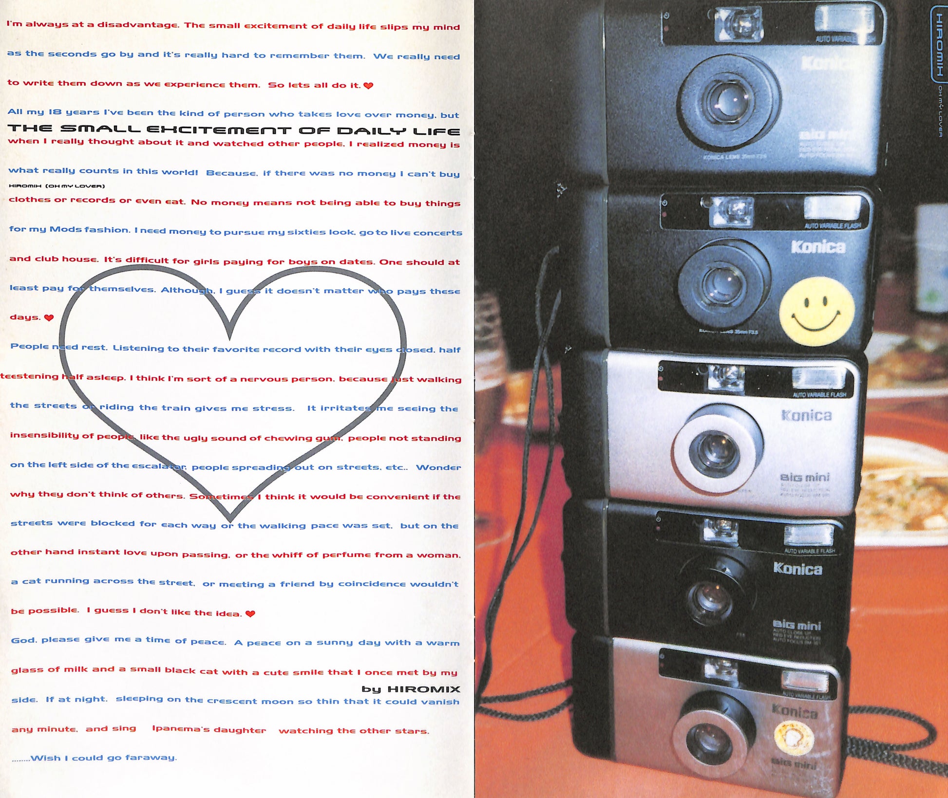 A photo zine and CD set by Japanese photographer and artist Hiromix – Toshikawa Hiromi – from 1996. Released in the midst of ‘girly photo’ mania (the boom of young female photographers) and a relic of the 90s Japanese photo scene, Oh My Lover features a music CD of Hiromix’s 1960s mod tribute group The Clovers, a photo CD-ROM, and images and writing by the artist. In 2003, Hiromix had a cameo in Sofia Coppola’s cult, Tokyo-set film Lost in Translation.