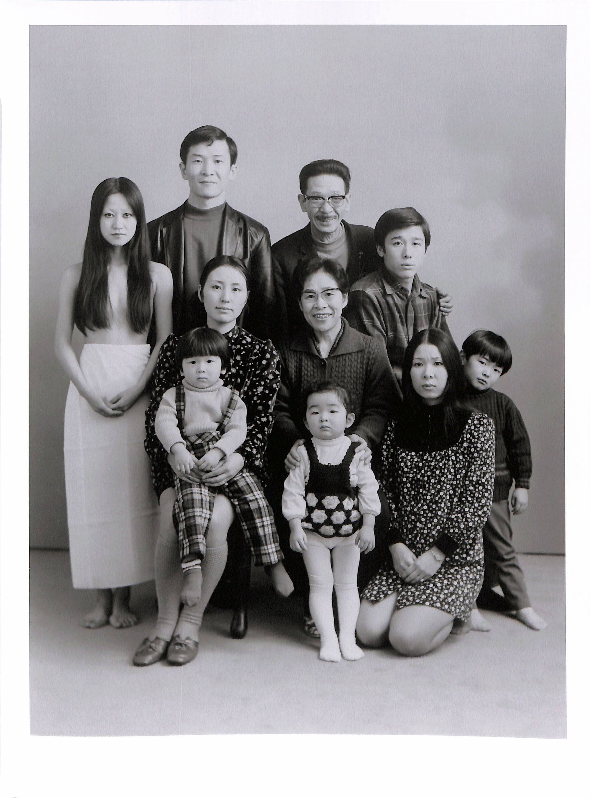 For three generations the Fukase family ran a photography studio in Bifuka, a small provincial town in the northern Japanese province of Hokkaido. In August 1971, at the age of 35, Masahisa Fukase returned home from Tokyo, where he had moved in the 1950s. He realised that the Fukase Photographic Studio, which his younger brother managed, combined with the growing family members, constituted the perfect subject for a series of portraits. Between 1971 and 1989, he returned regularly and used the family studio, the large-format Anthony view camera and the changing family line-up as the basis for the series. True to his style, Fukase often introduced third-party models and humorous elements to juxtapose the ineluctable reality of time passing and the dwindling family group. He continued the series through his father’s death in 1987, up until the closure of the Fukase studio due to bankruptcy in 1989, and the consequential dispersion of the family.