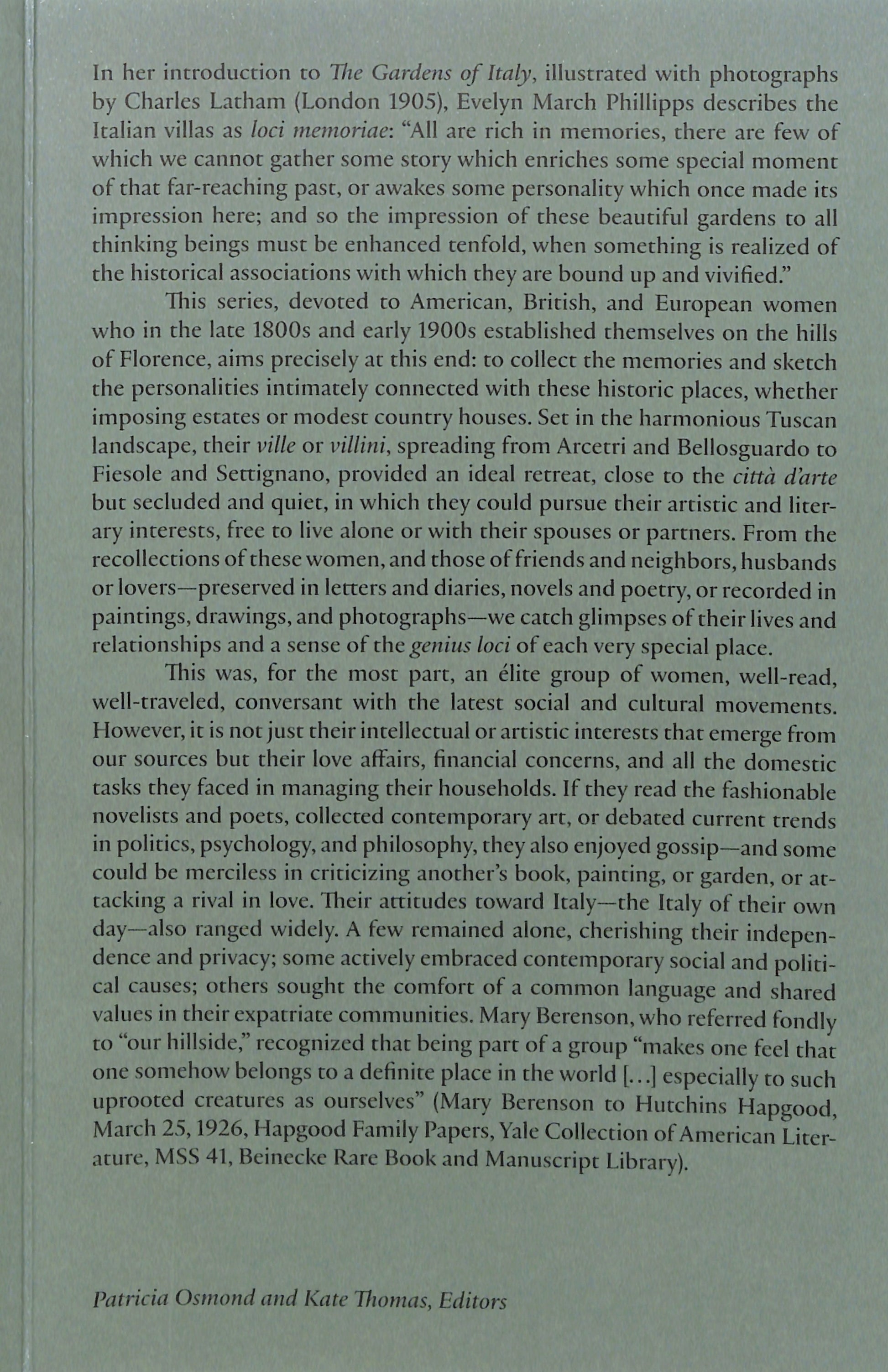 On the hillsides of Fiesole and Settignano, overlooking the city of Florence, the beautiful villas and gardens evoke memories of their former owners and residents—many of them American, British, and European women expatriates who made their homes here in the late 1800s and early 1900s, attracted by Florence’s artistic treasures, the Renaissance ideal of villa life, and the quiet, harmonious landscape. This series Our Hillsides. Women Expatriates and Their Villas and Gardens on the Hills of Florence 1890-1950 aims to revive and enrich these memories by recounting the stories of a group of independent and talented women: Mary Berenson, Catherine Jeanne Ghyka, Florence Blood, Vernon Lee, and Nina Auzias Stein. Drawn chiefly from contemporary sources—letters and diaries, novels and poetry, drawings and photographs—preserved in library and archival collections across the continents, much of this material is published now for the first time.