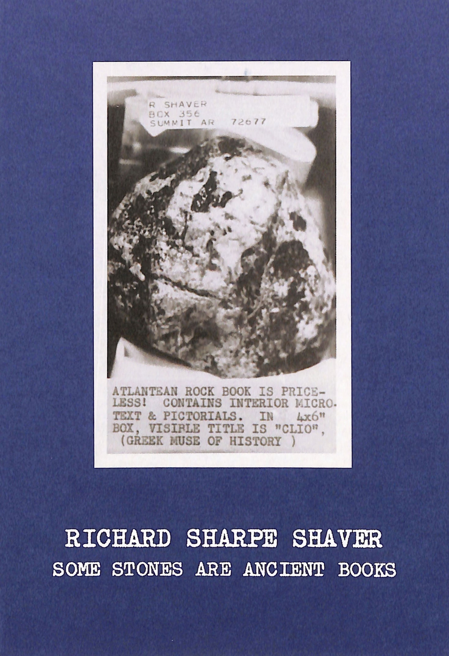 Science-fiction writer Richard Sharpe Shaver (1907–1975) believed that rocks were books. His controversial stories about an advanced prehistoric civilization and a race of evil beings living at the center of the earth appeared in Amazing Stories and other landmark sci-fi publications of the 1940s and '50s. A decade later he was living in relative isolation and devoting himself to rock book research, a course of study that he shared with a devoted fan base of students and correspondents. Richard Sharpe Shaver: Some Stones are Ancient Books contains a generous selection of Shaver’s Rokfogos, that is to say, rock-book documentation, accompanied by hand-typed texts in which he explains, not always patiently, what can be seen in these rocks. Also included are facsimiles of his handmade books and publications, all of which he felt to be of incalculable importance to civilisation.