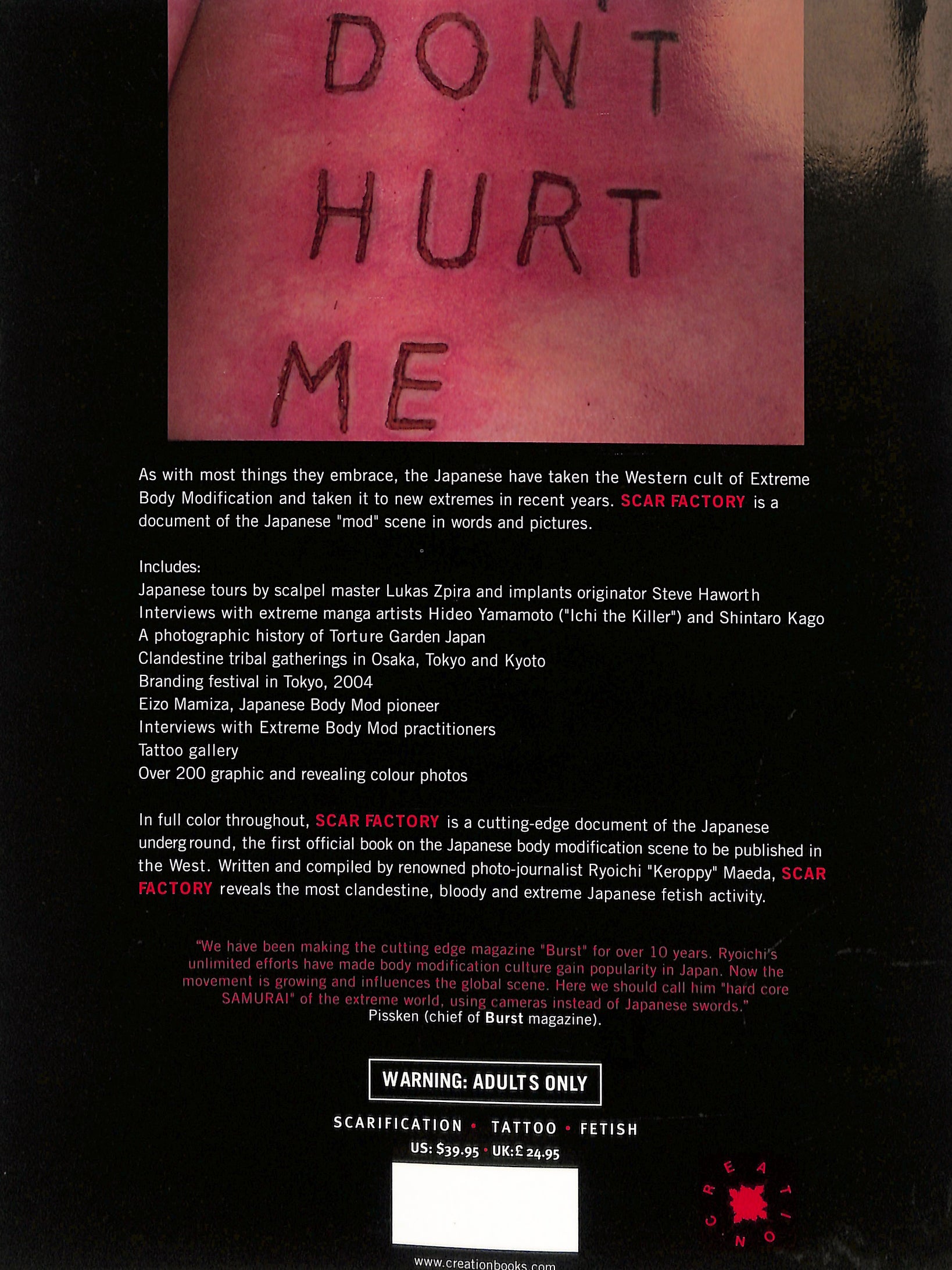 As with most things they embrace, the Japanese have taken the Western cult of extreme body modification to new extremes in recent years. Scar Factory is a document of the Japanese scene in words and pictures.