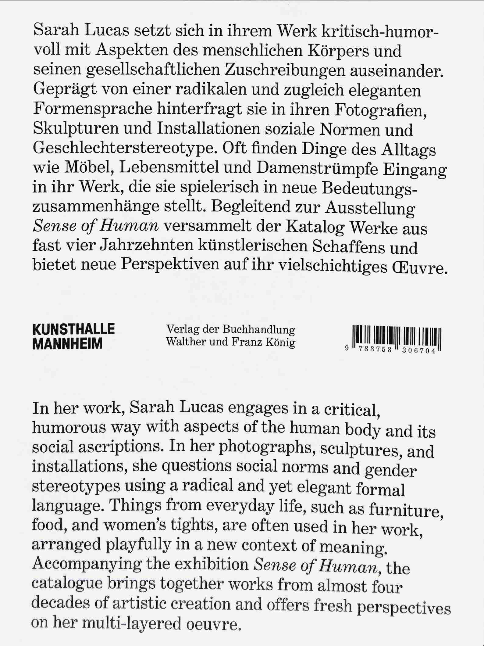 In her often provocative objects, photographs, sculptures and installations, Sarah Lucas cobbles together everyday objects to question social norms and gender stereotypes. Full of puns and raunchy innuendoes, her works isolate parts of the human body – breasts, legs and genitalia among her most frequent motifs – and place them in uncomfortable, uncanny situations. This catalogue brings together work from almost four decades of her practice. With both a title and cover image that illustrate Lucas’ tongue-in-cheek sensibilities, 'Sense of Human' is a fresh re-examination of a young artist enjoying a new cultural significance.