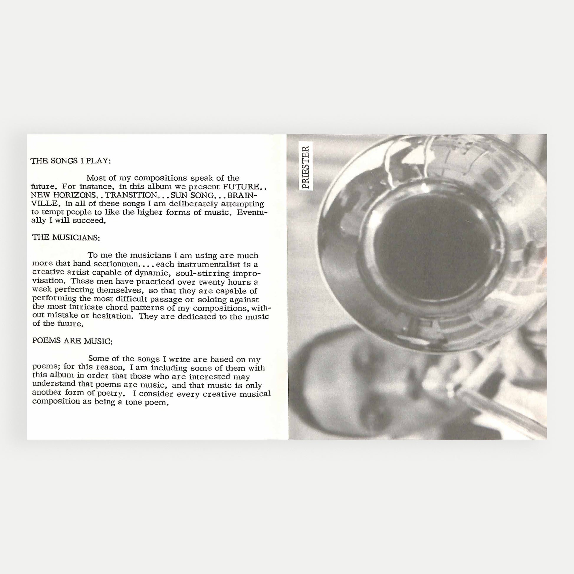 His debut, Jazz By Sun Ra, was issued in 1957 by the Boston-based Transition label, a short-lived company that sold records by subscription; this record contained a beautiful booklet, now as prized as the LP itself, with rare photographs and a selection of poems and proclamations, as well as the personnel and recording credits.