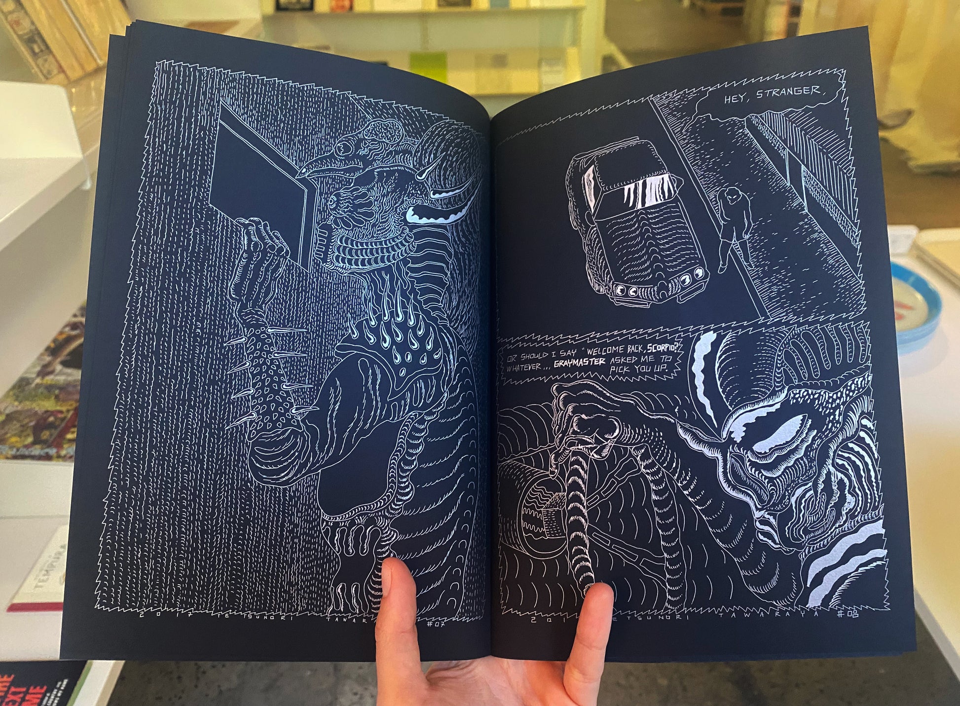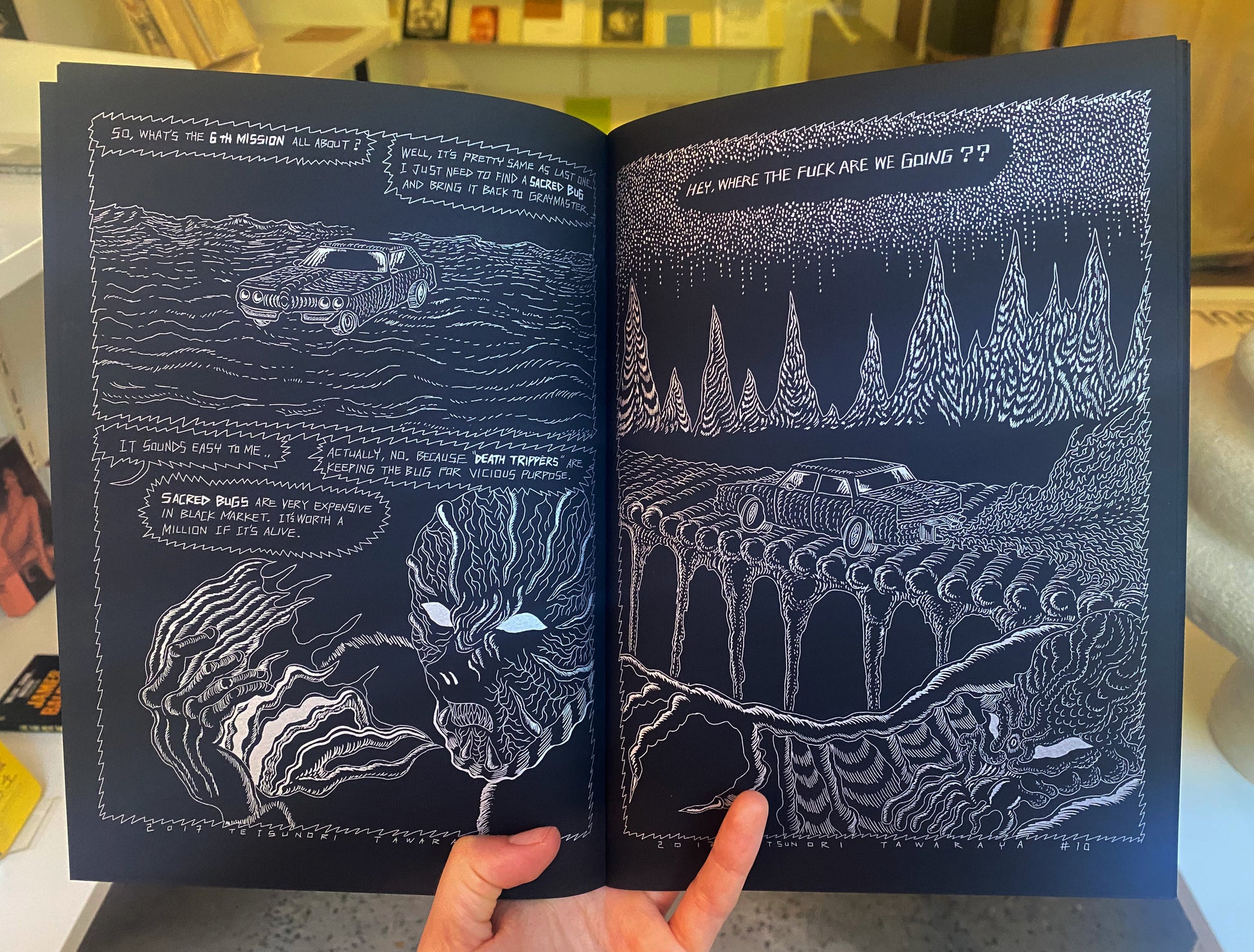 A black, acid, dark weird fantasy, punk, mutant story featuring scratchboard artwork by Tetsunori Tawaraya.