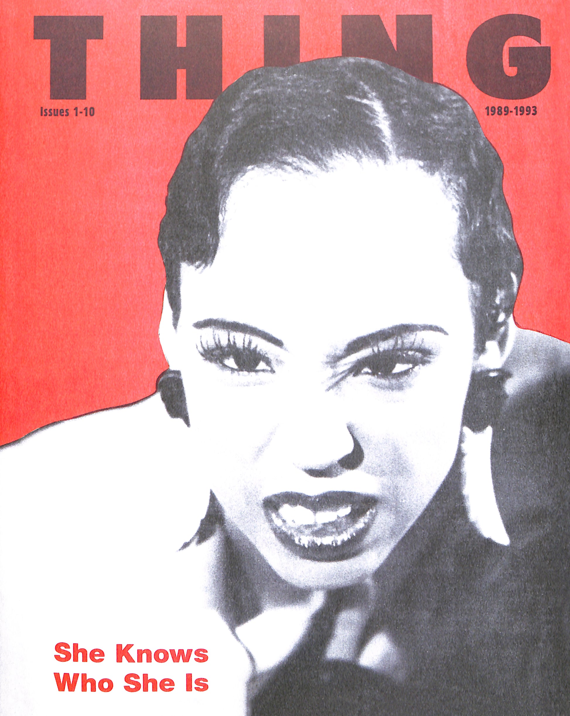 THING was very much in dialogue with the club kids in New York and other Queer publishing ventures, but in many ways, it fostered an entirely unique perspective – one with more serious ambitions. In a moment when the gay community was besieged by the HIV/AIDS crisis and a wantonly cruel government, the influence and significance of this cheaply-produced newsprint magazine vastly exceeded its humble means, presenting a beautiful portrait of the ball and club culture that existed in Chicago with deep intellectual reflections. THING was a publication by and for its community and understood the fleetingness of its moment. To reencounter this work today, is to reinstate the Black voices who were so central to the history of HIV/AIDS activism and Queer and club culture, but which were often sidelined by white Queer discourse. In many ways, THING offered a blueprint for the fundamental role a magazine plays in bringing together a community, its tagline summing up the bold stakes of this important venture: 'She Knows Who She Is.'