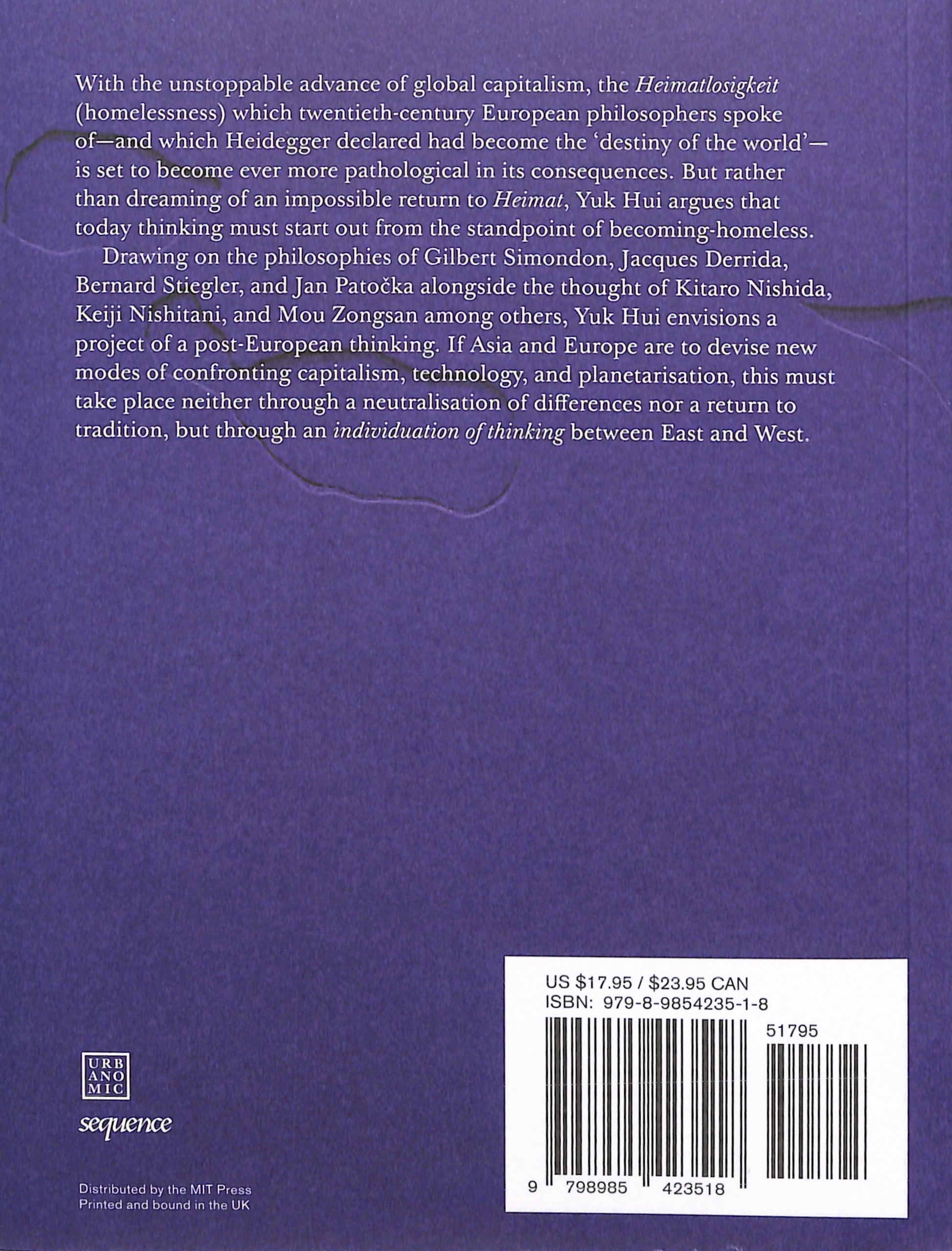 Following Novalis’s suggestion that philosophy is a form of homesickness, Jacques Derrida’s claim that philosophy is intrinsically European, and Bernard Stiegler’s insistence that philosophy’s logos is inextricable from the techne of technology, in Post-Europe Yuk Hui envisions a project of a post-European thinking. If Asia and Europe are to devise new modes of confronting capitalism, technology, and planetarisation, this must take place neither through a neutralisation of differences nor a return to tradition, but through a new individuation of thinking between East and West.